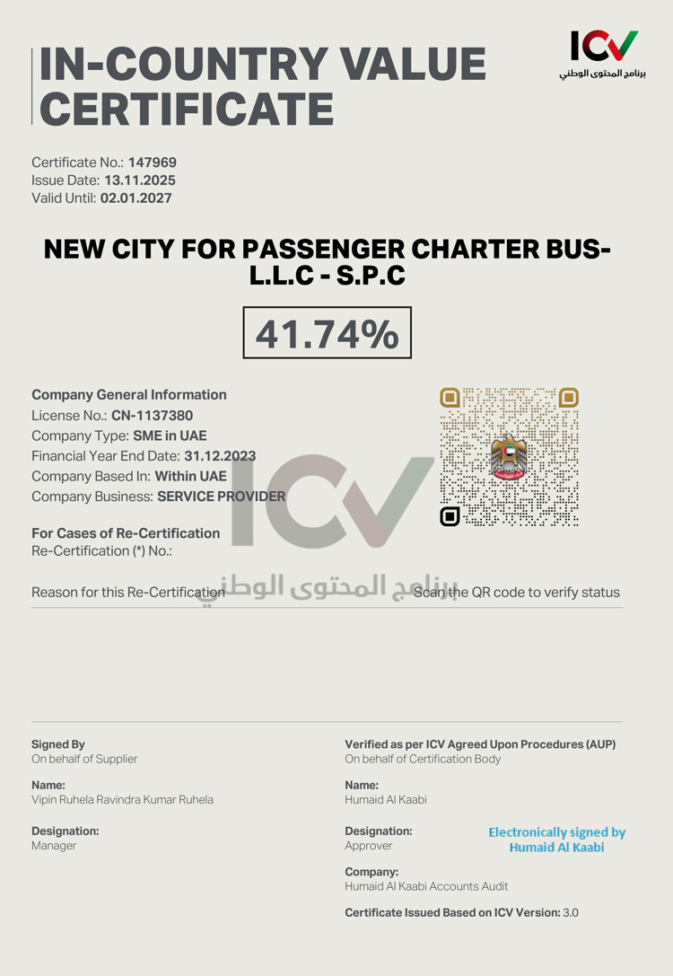Based in the vibrant capital of the UAE, Abu Dhabi, we proudly stand as one of the most forward-thinking and environmentally conscious transport providers in the region. Our commitment to sustainability is reflected in our impressive In-Country Value (ICV) score of 53.10%, showcasing our dedication to local development and excellence.